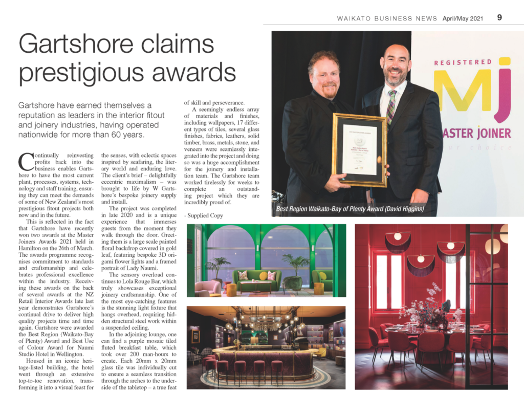 Waikato Business News published an article in their April/May 2021 issue about our recent Master Joiners award wins (Best Region Waikato-Bay of Plenty and Best Use of Colour) for Naumi Studio Hotel Wellington.
