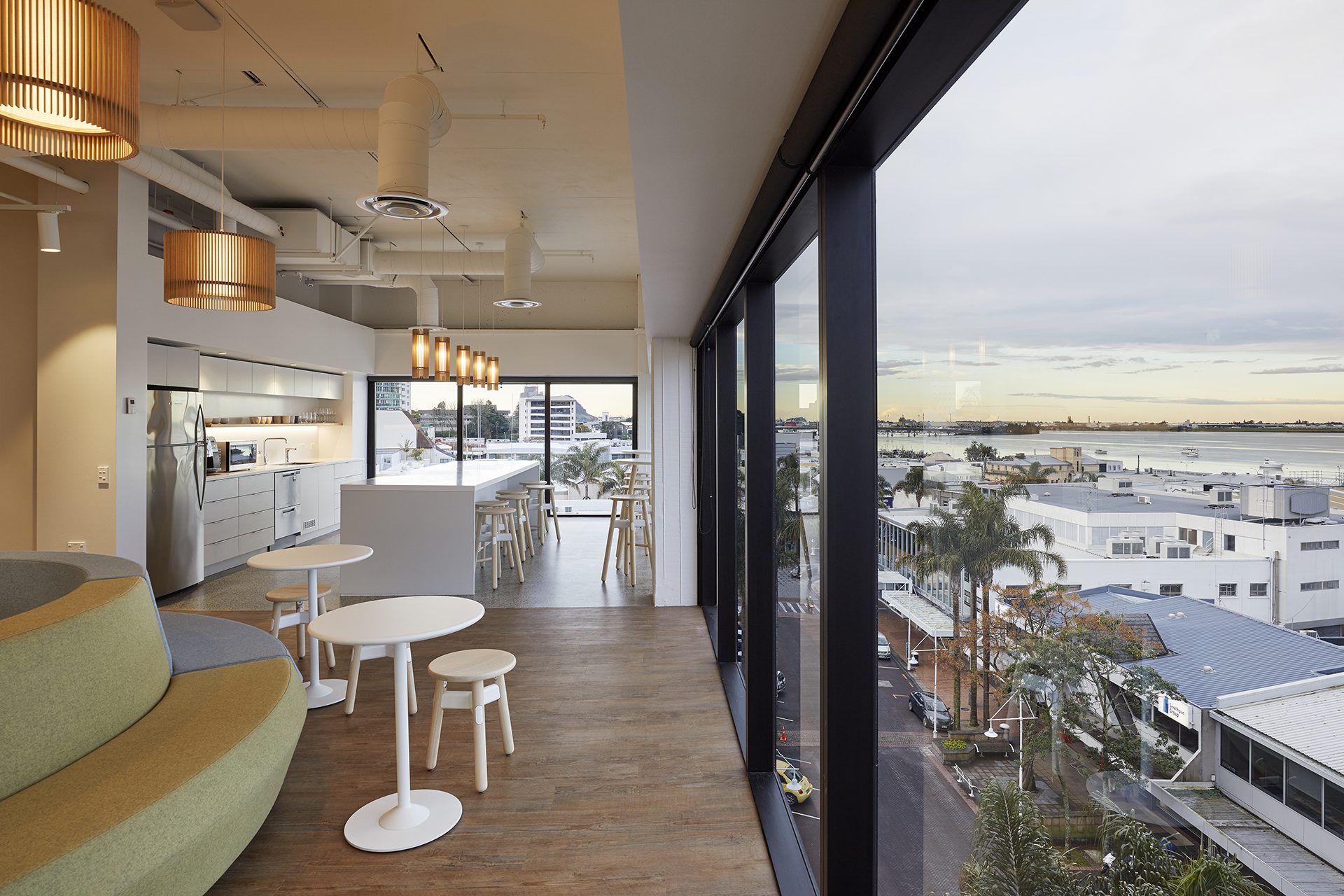 The combination of the exposed industrial ceiling design, modern meeting rooms and workspaces, casual and fun cafeteria enhanced by ambient drop feature lighting and timber floors, not to mention the magnificent views, this office is cutting-edge.